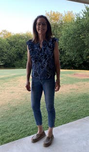 I wore it out for dinner with friends. It’s a great fit, perfect length to slightly tuck if you like. The ruffle sleeves make it an easy dressed up but casual look!