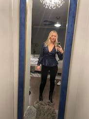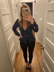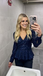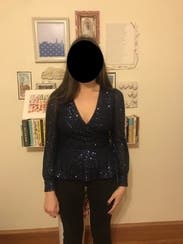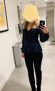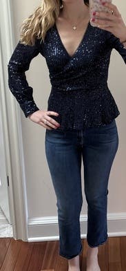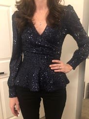 This shirt is one of my all time favorite rentals! It is a beautiful dark blue color and the sequins make it sparkly and fun! I wore this to dinner and the theater, it was the perfect combination of dressy yet casual. The shirt is a flattering peplum style, that zips up at the back. The fabric had the perfect amount of stretch so it is fitted but not uncomfortably tight. I received so many compliments - do yourself a favor and rent this one!!