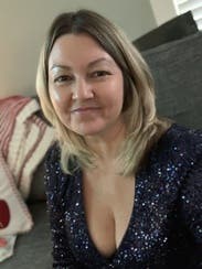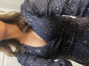The sequins, color, and fit are fabulous. The button didn't stay clasped but I thought the amount of cleavage was fine for dinner!