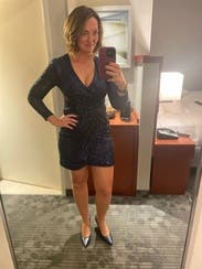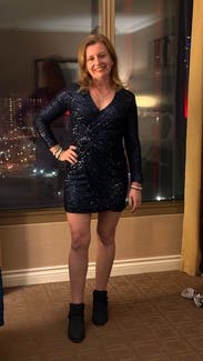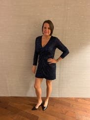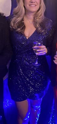 Didn’t wear this to an upscale party in the end. I chose this dress to try on as it looked fantastic on so many other woman - of all shapes and sizes. On me I really liked the overall look of this one - the fabric and sequins felt and looked high end, the deep blue color was rich, the wrap draping was perfect for hourglass figures including hiding any belly bumps. But, in the end I think the wrap dress in a dark color looked too close to the many work dresses I wear it wasn’t as unique as what I was looking for the event. In fact it would be perfect if I had a work party to go to and will for sure order it for that type of event in the future.