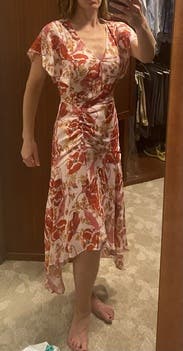 This dress is beautiful and I can see why it gets such good reviews- silky fabric in a great spring/summer print, can be dressed up or down. Only complaint is that it's proportionally tight in the hips but loose in the waist- so it creates the slight appearance of a bigger tummy. That said, it's a great dress and would rent again.