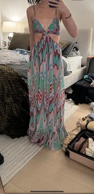 This dress is everything! The underneath is a bodysuit and was super small/tight, i have a long torso and it barely fit me, wish i would have sized up. The colors are incredible, perfect for vacation. Will likely rent again. for more photos & videos @whimzylindzy