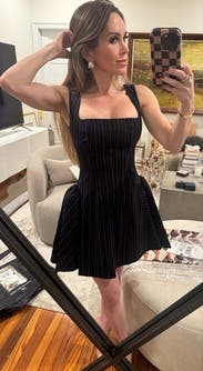 The sleek black pinstripes give it such a simple, classy look, while the square neckline keeps it modern and flattering. What really stood out to me were the structured flares on the sides, they add just the right amount of movement and femininity, almost like a playful twist on a peplum. I was unsure about it at first, but wearing It out felt fun, flirty, and unique without being over the top. A perfect balance of simple, polished and edgy!