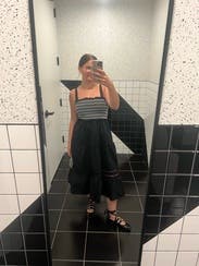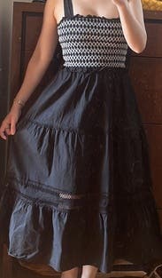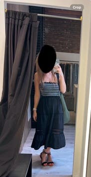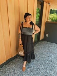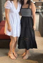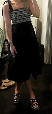I wore this dress so many times through the summer - to work events, lunch and dinner dates, family affairs... it can be dressed up or down and is so very comfortable. The open stitching at the bottom is a wonderful accent and the stretchy top and tie-yourself straps make it easy to wear. Considered purchasing to keep but returned as the weather is getting colder.