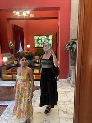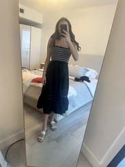 This dress was great for a dinner on vacation! As others mentioned, the straps are a bit weird / need to be tied cutely and the dress is a bit heavy. But I think the material of the skirt makes it feel more luxurious, it didn’t make me hot or anything. I really love the cut outs at the bottom of the skirt. It is long but not too long in my opinion!