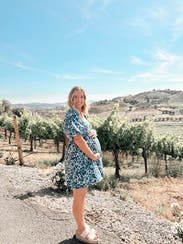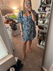 I wore at 32 weeks pregnant so I sized up to a medium and it was perfect. So cute for a rehearsal dinner and not too short for a semi-tall girl