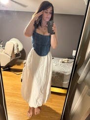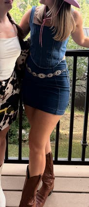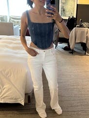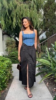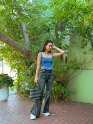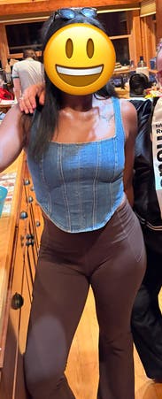 I am obsessed with this denim corset top! 🤍 The fit is amazing, it has just the right amount of stretch, so it’s super comfortable without losing that structured look. What I love most is the versatility: I can throw it on with sneakers for an edgy vibe, or pair it with strappy sandals and linen bottoms for a cute look. Definitely a closet staple for anyone who loves to mix it up.