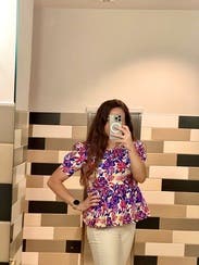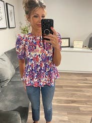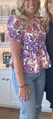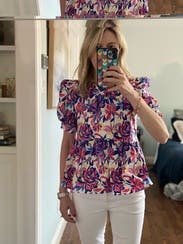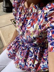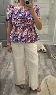 Loved this blouse. The colors were so vibrant. The shoulders were puffed and the bottom ruffled which really made this a great looking top! Went perfect with white pants.