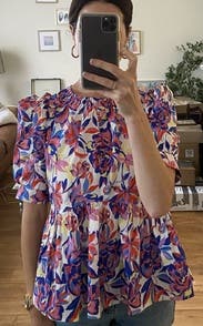 Great work top! I’m typically a 4/size small and the 4 fit me a little loosely which is just how I prefer. Colors are vibrant and fabric is rigid enough to keep its peplum / puff sleeve shape without feeling too stiff