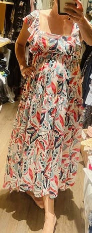 Was almost too long for my 5’3 height. Was slimming from the front, but the empire waist was just too high for me on the sides and didn’t glide down my body in the way I wanted. I will say it moved BEAUTIFULLY in the wind. So it you’re looking for an effortlessly beach/frolicking dress to snap photos in, I’d suggest trying this. bust: 34 waist: 28/29 top: 2/4 bottom: 6/8