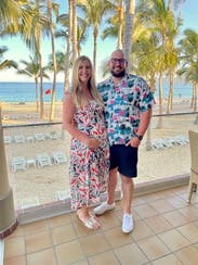 Just getting into third trimester and I wore on vacation. I was about 175/180 and size 10 worked. I felt pretty and this was comfortable!