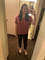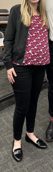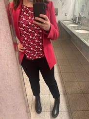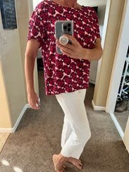 This was an easy flowy top that I wore to the office paired with navy trousers. I really liked the print and dark pink color of the top. Its definitely a looser fit and I could’ve sized down to an xs for sure!