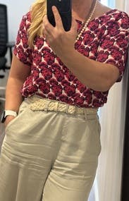 This blouse is darling, print also comes in a dress. The fit is loose which is perfect for summer. I wore this multiple times. I wore with shorts and white jeans for an easy pulled together look. I would rent again.