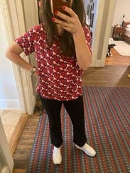 I wore this with a pencil skirt for work. Loved the pattern. It was an oversized fit and fabric wasn’t exactly soft but it looked good tucked in.