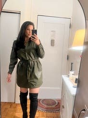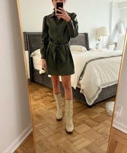 Loved the color of the leather and the belt to give it a more fitted feel. Paired with some camel colored leather boots