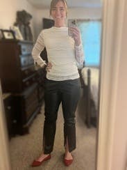 Hard to see but wore these to a concert in Vegas dressed up with a fun top and heels but have also worn to work with a nice sweater - a great versatile pant - I’m 5’4” and need heels no matter which way you style them