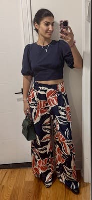 Not necessarily my favorite rental ever, but a cute date night option for a summer night. True to size. Can’t wear a traditional bra. Despite it looking like the bottom was tight, it didn’t feel tight at all. Light material and I love the navy with black velvet ribbon combo.
