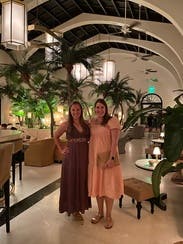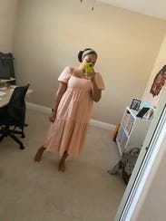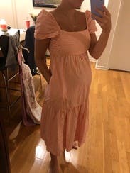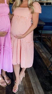 This dress is so pretty (though does wrinkle easily) in person! My regular size still fit well even at 8 months pregnant. Was a little tight in the chest