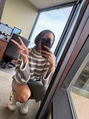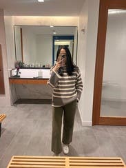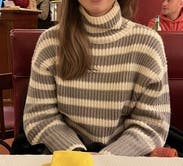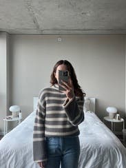 Adored this design with the stripes and colors and wide sleeves. Unfortunately the bottom of the sweater was too tight around my waist. I don’t have too much hip or butt and this just fit so tightly. I was able to tuck the sweater into my bralette and wear like this. But will not rent again.