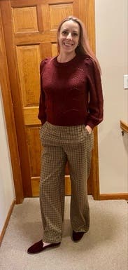 This sweater is a gorgeous, rich color, but the sparkle is very low key. That actually made it more elegant and easy to wear. I paired it with jeans and trousers and wore it for work, family events, and date nights.