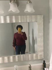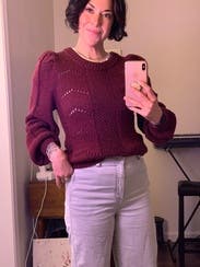The color of this sweater is a purple-ish brown. It was very pretty! I liked the puff shoulder/sleeve. This detail was perfect and not over-the-top. Even though there are holes in the knit design, I didn't have to wear a cami underneath. It wasn't too cropped either. I am wearing them with midrise jeans in my photo. I am usually between a small and an extra small and the extra small fit perfectly. I will definitely rent this one again!