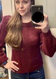 Good fitted sweater for winter. A little see thru, but I just wore a black bra and no one minds. Not so fluffy that it adds weight to you like many warm sweaters do. Nice red wine color.