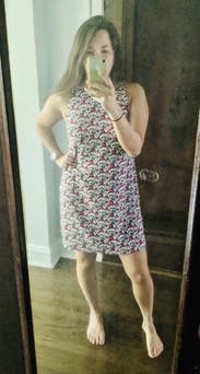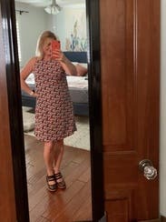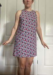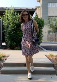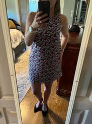 I really like the print and colors (deep pink and navy blue floral) of this dress. I love a good shift dress, it feels quintessentially summer. I’m reasonably curvy on the bottom and my regular size (4) fit well without pulling across the hips and backside. It’s fully lined with a polyester satin so that won’t be very comfortable on the hottest or most humid days, but luckily it’s not that sticky or warm this week where I am. Solid dress, could be dressed up or down but i am wearing it for every day.