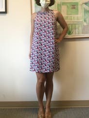 White navy and reddish\hot pink. This dress is lined and has a hidden zipper enclosure up the back. It is cut away from the body and very easy to move in. I was pleasantly surprised to find it also has pockets, which is great to store your phone, or random items your toddler hands you.