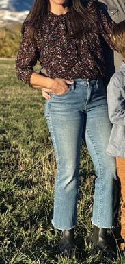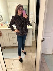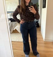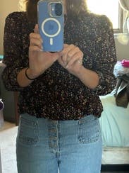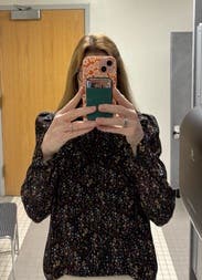 The sleeves on this are very long, so good for tall people! It’s a good elevated basic shirt for work. Nice small floral pattern in muted colors. There is some stitching in the shoulders around the puff sleeve that is kind of itchy which is a bummer.