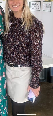 This blouse was very flattering and fit great. Held its shape through two wears during my rental period. I loved it with a skirt and heals.
