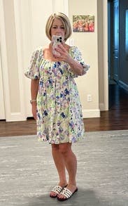 The watercolor print on this dress makes it feel like you're wearing a painting! Love the shape of this - so easy to throw on but so flattering. If you have a larger bust, I'd recommend sizing up since it's an empire shape. The dress is standard bra friendly and very stretchy creating such a comfortable fit! This dress is very versatile and can be dressed up or down.