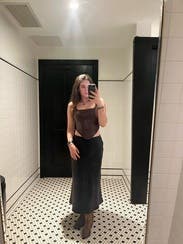 Wore this on a dinner date with a casual shorts suit separate. Loved the softness and deep eggplant purple color. Could have sized down as there is a bit of stretch and a zipper on the side to easily take on and off. Pretty but…Not an easy piece to style and will not likely wear again.