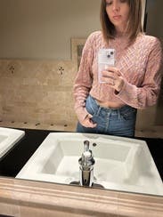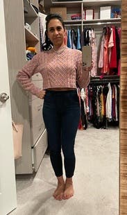 This sweater is so cute and soft. It is VERY cropped but I prefer that look so it was just right for me. Probably would be too short too wear to work if you have a job where showing a little stomach skin is inappropriate but for a fun day or evening out it’s adorable