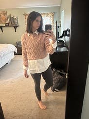 I tried this sweater on with so many different skirt/pants options, I even rented the skirt pictured on the model. I just did not like it until I paired it with the oxford shirt underneath.