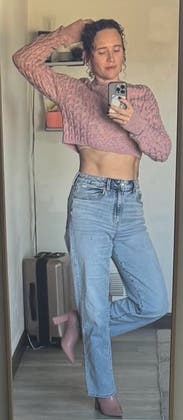 Adored this sweater. The colors are super fun! I loved that it was cropped and found that I could pair it with almost any type of jeans. Be mindful that if you're apprehensive about cropped pieces, it's VERY cropped. I have a short torso and you can see how much it rises when I lift my arms. The material is somewhat stiff and scratchy, but I adjusted after the first wear.