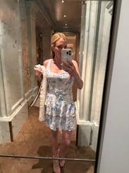 Flirty little sundress. Needs some nude shapewear underneath bc you can definitely see through the holes in the design. Flattering and adorable. Short!!