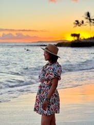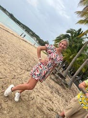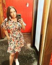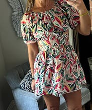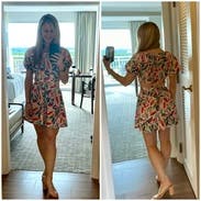 The fun print is vibrant and eye-catching, perfect for making a statement. The small cutouts add just the right touch of style, making the dress feel unique and chic without being too revealing. I love that it’s short, which keeps it flirty and cool for warm days. Plus, it's incredibly comfortable! The fabric feels soft against the skin and has a nice stretch, allowing me to move around easily without any restrictions. This dress is perfect for casual outings, weekend brunches, or even a night out with friends. It definitely gives off that effortless, fun vibe.