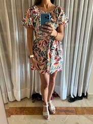 This was a fun little dress to wear! The colors are bright and eye catching, and the cutout in the back makes it flirty. Has poofy sleeves, but they aren't overwhelming. Fit is TTS and hit at a good length on me. Required a bit of steaming to get it to lay correctly.