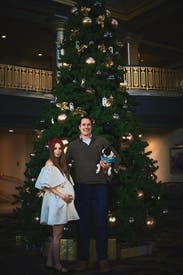 Wore this for our holiday card photo. Fit great at 30 weeks. Before pregnancy size 0/00. Wore a 4 and it fit perfectly for my 3rd trimester.