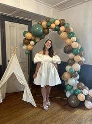 Wore this for my baby shower at 29 weeks pregnant! I saw a lot of reviews were for bridal event looks but the fit totally works for maternity. I justified wearing white in October because my “Labor Day” isn’t until December ;-)