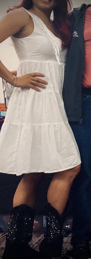 This is just a basic white sundress but it does that very well. I found the bodice ran large, although the straps are adjustable (you can tie them tighter) so that helped. Skirt had a lot of volume but that was the look I wanted. Photographs so well and great for the beach or any summer night