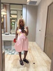 Personally, I had to rent this because it was pink and I’m a pink girl! I actually really love the uniqueness of this dress because of the top was super cool knit fabric and the bottom was squishy fabric. I love wearing my pink Adidas with it honestly it’s not super flattering and would say revealing on top, but I didn’t care I loved it all the same.