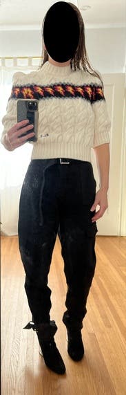 Fun lightning bolt sweater. The shoulders are pretty poofy, hard to wear a coat over it. It’s very warm. Pretty cropped, best with high waisted bottoms.