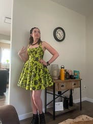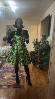 This dress was a little tight in the waist. Rented for a party that was outdoors and it was too cold for this dress. It’s beautiful however. Fabric holds the shape of the skirt. The dress is lime green and black. I would rent again when the weather is warmer