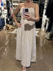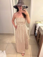 Wore this for an outdoor event in early summer & received lots of compliments ! Got a Small and Medium, wore the Small and it fit great. Could’ve maybe sized down to the XS for a tighter fit on the top, but I was comfortable. Length with low wedge was perfect & the adjustable straps came in handy