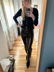 Big fan of Pistola’s faux leather pants! They run a little long for the short girls, but they worked perfectly with a 3-inch heeled bootie. I usually wear a 24 or 25 in Pistola denim, and the 25 fit perfectly in this faux leather style. Would definitely rent again.