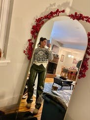 Literally loved these pants and wore them to two separate holiday parties—one for work and one with friends. They’re shiny and almost look chrome in dark lighting. I rented my normal size and the fit was perfect.