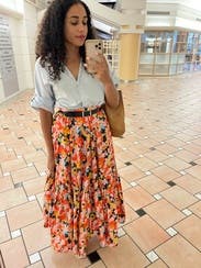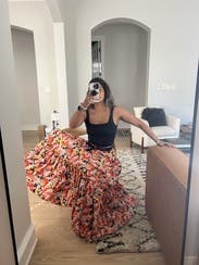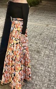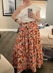 I may not ever give this skirt back. I love it. Beautiful colors, full skirt, and a long length which is great on my 5’7” frame. I wore it for family photos, to work, on vacation, and on dates. I’m usually a size 4ish (2 waist, but larger hips) and rented a 40 but probably could size fine slightly for a even better fit at the waist.