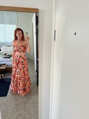 Loved this skirt with the matching top. It was a little big on me all around—too long, even with platform sandals—and the waist was an inch or so too big. I ended up safety pinning the waist so it sat higher and brought up the hemline. It worked out great. Like other reviews said: it’s a lot of fabric and would be hard to pack.