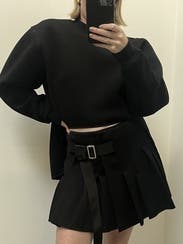 The Plan C Pleated Buckled Mini Skirt offers a structured, preppy-with-a-twist silhouette featuring sharp pleats and a standout buckle detail. Style this skirt with an oversized cashmere sweater and knee-high boots to achieve a sophisticated, textural contrast.
